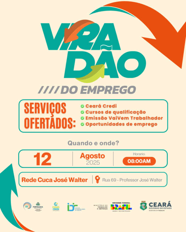 Na ocasião, ocorrerão cadastros para vagas de emprego, inscrições para cursos de capacitação profissional, orientações do Ceará Credi e emissão do cartão VaiVem, que garante acesso ao transporte gratuito na Região Metropolitana de Fortaleza (RMF), além de empresas locais realizando recrutamento presencial,